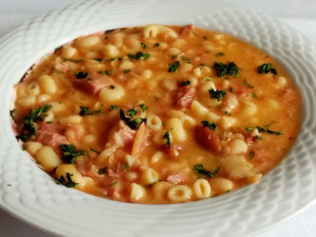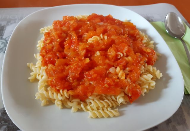 Danes za naju s sinom paradižnikova omaka s testeninami, zame z dodatkom gamberov, za moža segedin iz zaloge, domač kruh
