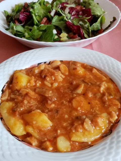 Vampi (iz zaloge), s prepraženimi jurčki; mešan radič s krompirjem, mlado čebulo in prepraženo slanino; zalito pecivo