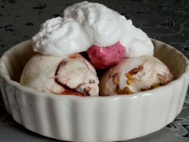 Prosena kaša na špehu in čebuli, pišč. file, želodčki in jetrca z vinom; zelena solata z mlado čebulo; sladoled