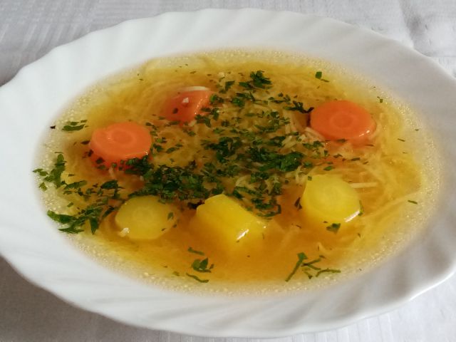 Goveja juha z ribano kašo, govedina, pecen krompir, pohane bučke, solata iz vrta, jagode, smetana, kava