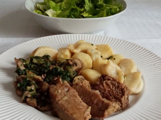 Goveja juhica; popečena gov. iz juhe, šampinjoni z blitvo, njoki; zelena solata