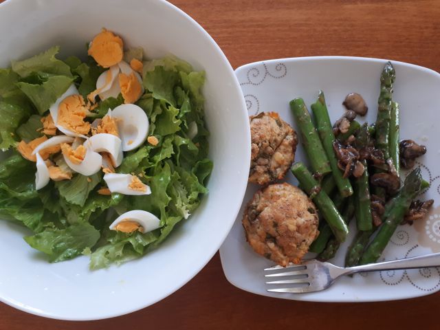 Solata z jajcem, šparglji z gobovo omako in dva tunina jajčno-sirna kolačka.