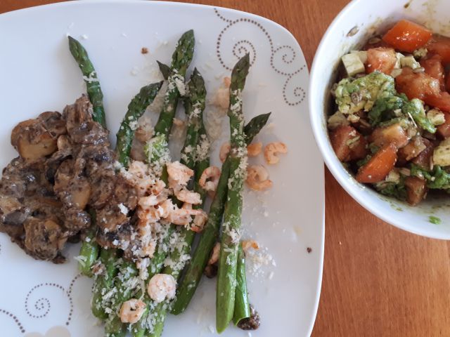Šparglji s kozicami in parmezanom, gobova omaka, paradižnik s feto, avokadom in sončničnimi semeni.