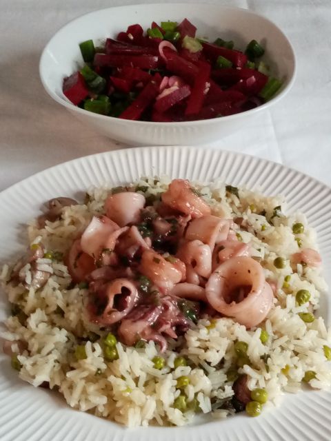 Basmati riž z grahom, kozice/lignji na česnu in vinu, rdeča pesa z mlado čebulo