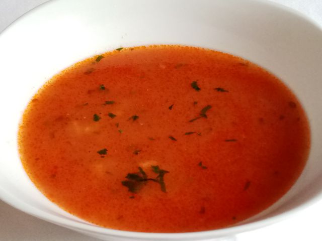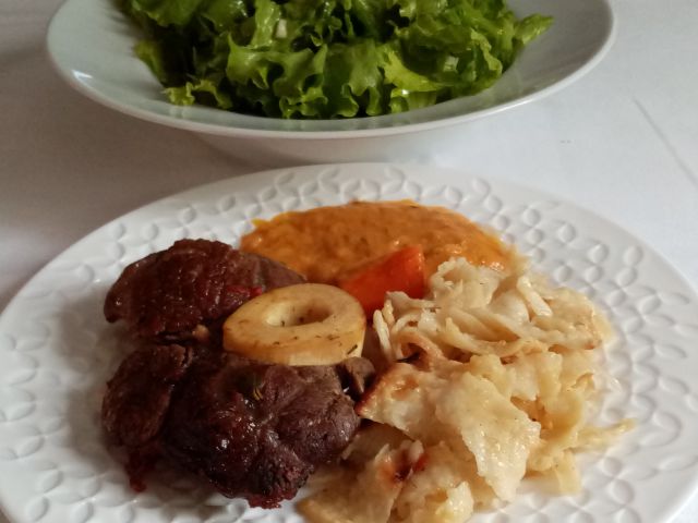 Paradižnikova juhica z rižo; osso-buco, mlinci; zelena solata