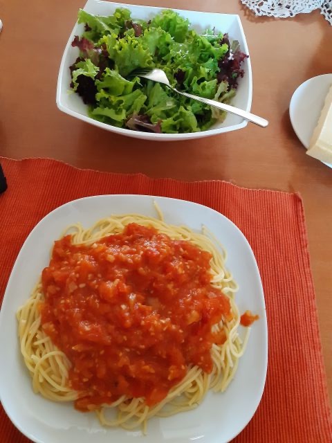 Včeraj sem kuhala bob po x letih, s piscencem in testeninami. Tud poslikat nisem utegnila, so bili tako lacni. Zelena solata in berivka, ter kumare s paradiznikom in mlado cebulo. Posladkali smo se s caprese tortico, jagodami in smetano,