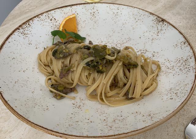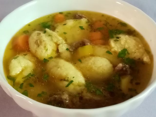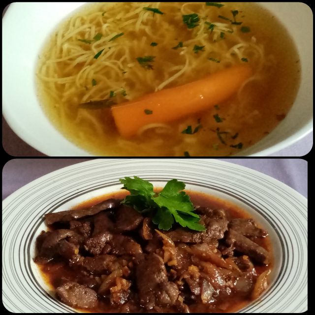 Danes pa spargljeva juha, ramstek, smetanova grahova poprova omaka, dusen riz, solata. Jagode s smetano, mangov sorbet In kozarec domacega terana.