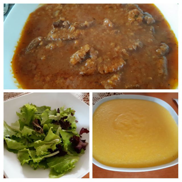 Goveji trakci v omaki, polenta, solata z vrta