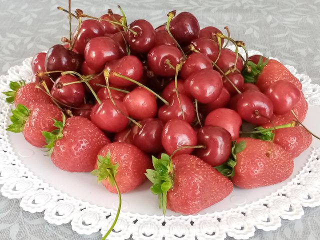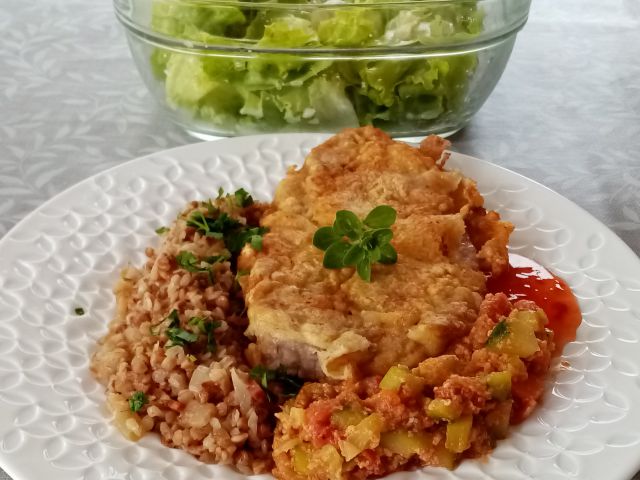 Ajdova kaša na slanini, dušene bučke s šalšo, po pariško panirana vratovina; zelena solata; jagode in češnje