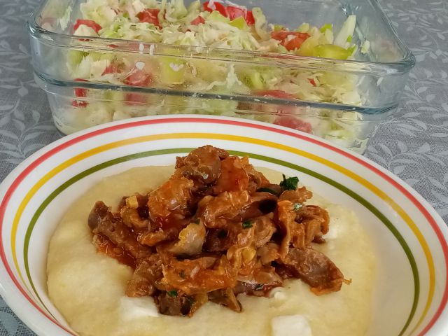 Piščančji želodčki, polenta/pšenični zdrob s feto; mešana solata