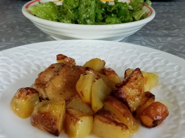 Piščančja juhica z zdrobovimi knedlčki, pečen krompir in piščanec; zelena solata