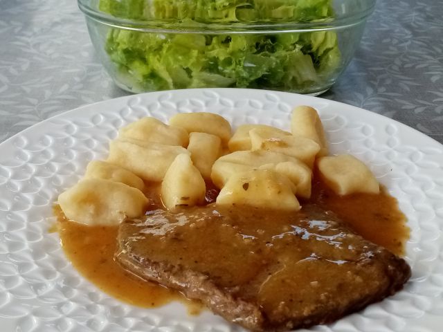 Njoki, gov. zrezki v omaki; zelena solata