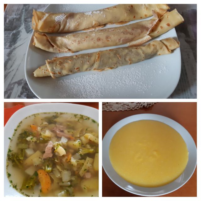 Zelenjavna mineštra s teletino, polenta, kruh, palačinke z jagodno marmelado in še z nutello za enega