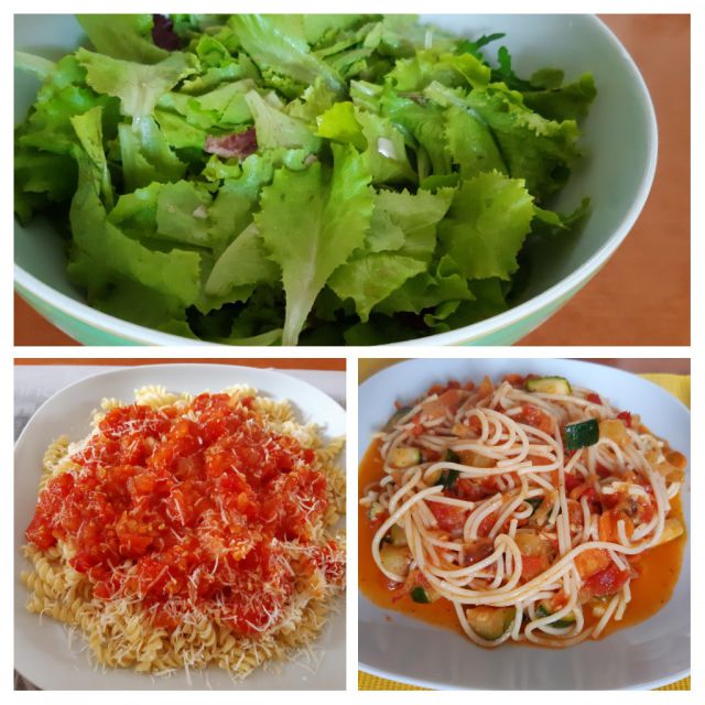 Danes paradižnikova in zelenjavna omaka s testeninami, zelena solata