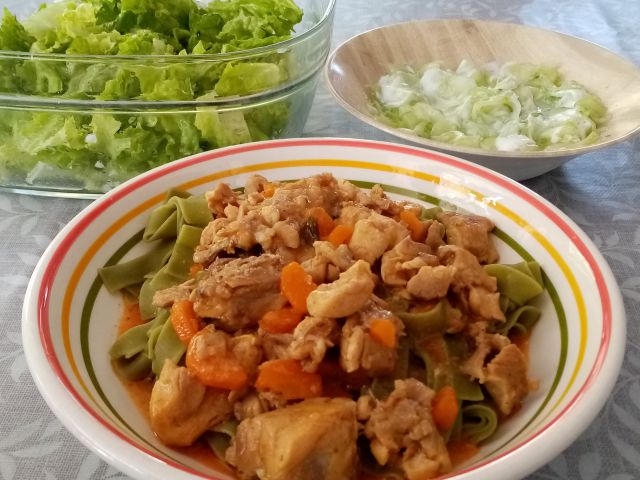 Piščančji paprikaš, zeleni rezanci; zelena solata, kumarice z jogurtom