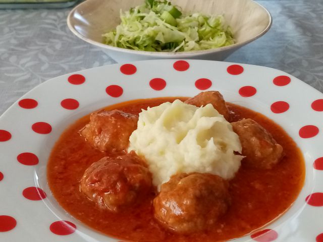 Čuftice v omaki, pire (krompir/zelena), zeljnata solata