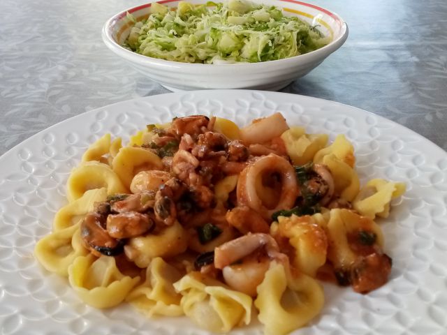 Ravioli s pršutom, morski plodovi v vinski omakici s česnom; zeljnata s krompirjem... za po vrhu hladen radler