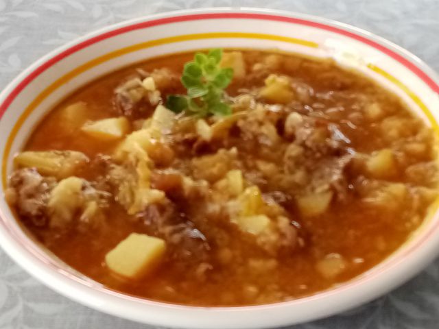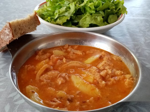 Grahova juha, srna v omaki, bučkina zloženka iz vlečenega testa, solata iz vrta, kava