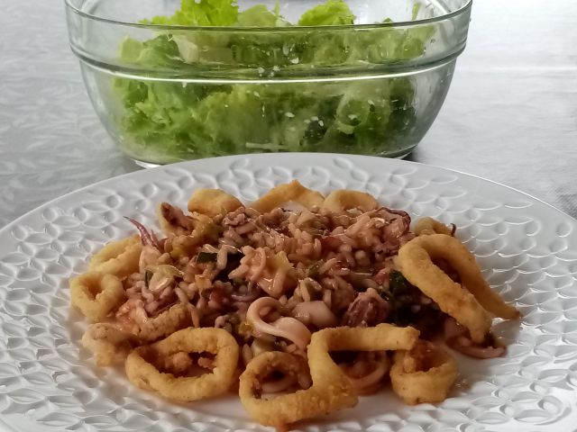 Rižoto z lignji, še malo praženih lignjev; zelena in zeljnata solata
