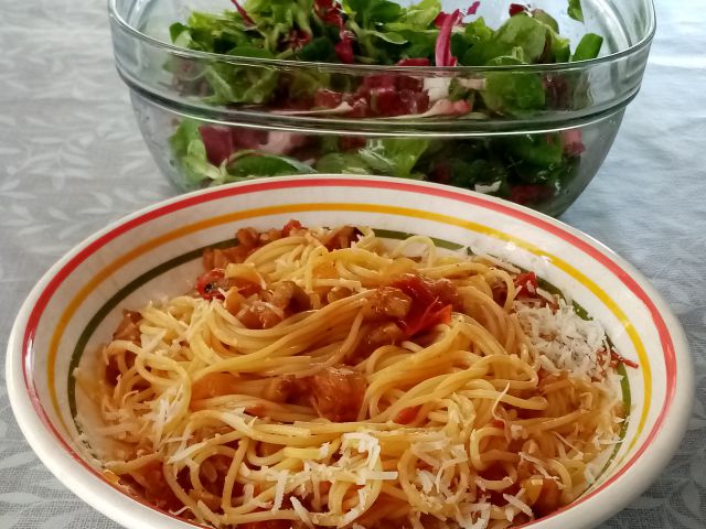 Špageti s šalšo, motovilec z radičem; skutni zvitki