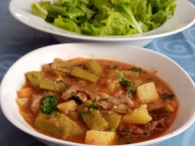 Juha Hokkaido buče, jetrca pražena, pire, solata iz vrta, domači piškoti, kava