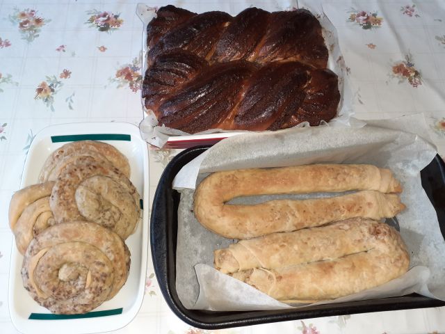 Prejšnji teden sem spekla še za možev odhod na pardnevni ribolov ter za domače crkljanje čokoladno babko z drožmi, mesni burek in jabolčni zavitek, katera sta tudi imela droži v testu.