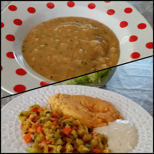 Gobova juhica; dušena bučka in korenček, piščančji zrezek po pariško; zelena solata