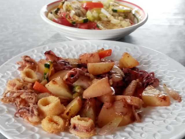 bučko, še malo frigani lignji, mešana solata; kozarec belega vina