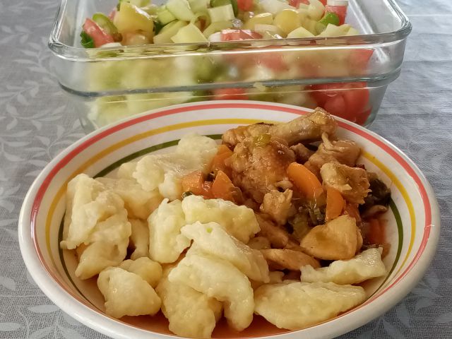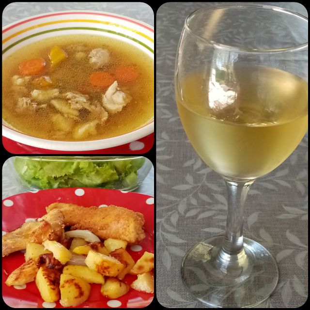krompir v srajcki ("jacket potato"), narejen v mikrovalovni. Seveda ni isto, kot ce ga naredis v pecici, ma ce nimas dosti casa, je se vedno v redu.