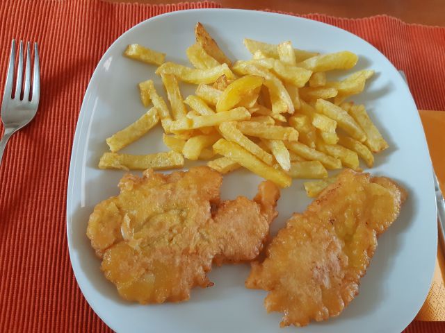 Danes pariški, pomfri, kumarična solata