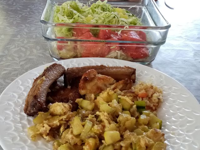 Ostanki mesa od včeraj, dušene bučke s porom in jajci; zeljnata solata, paradižnik