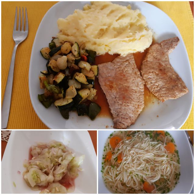 Danes goveja juha z rezanci, pire krompir, dušena zelenjava, zrezek, kumarična solata