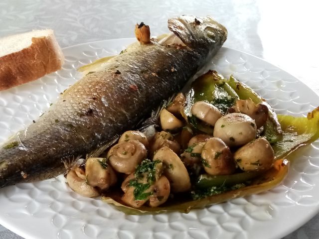Juhica; brancin iz pečice, pečena paprika in šampinjoni s česnom in peteršiljem