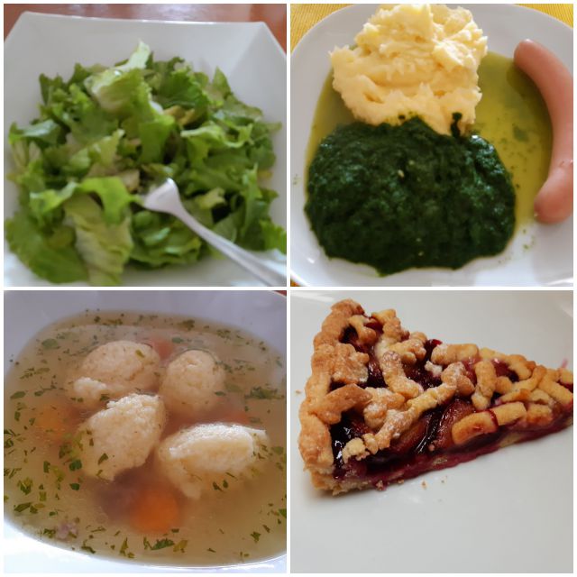 Danes goveja juha z zdrobovimi cmoki, špinača, pire krompir, hrenovke, zelena solata, pita