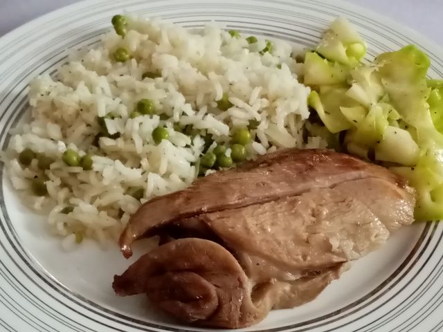 Bučna juhica; basmati riž z grahom, pečenje mladega kozlička (dobila pečeno), bučke s česnom; sladica od včeraj