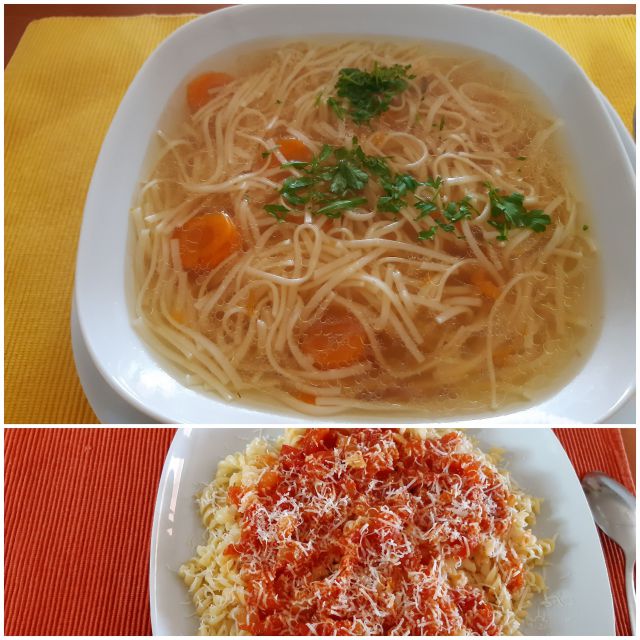 Včeraj za naju s sinom preostanek goveje juhe z zdrobovimi cmoki, paradižnikova omaka, za moža paradižnikova omaka z dodanimi bučkami, papriko in čilijem, testenine, zelena solata