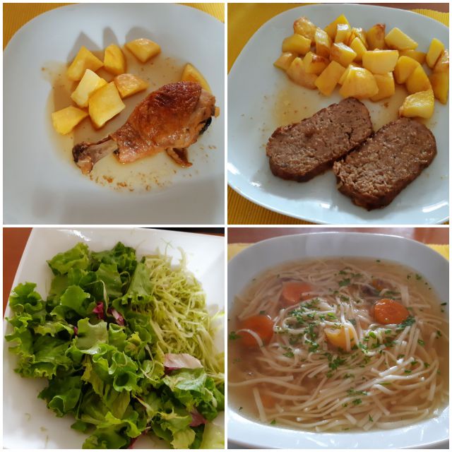 Nedelja: sataraš (pri nas je večinoma brez jajc), basmati riž in pečen piščančji file, mešana solata, sladkali smo se s slivami