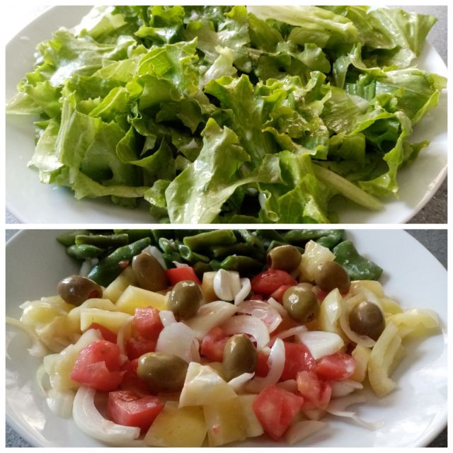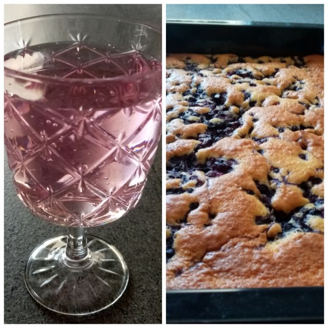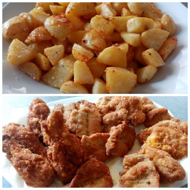 Pečen krompirček, panirane pišč. nogice in sv. file, zelena solata, mešana solata; borovničevo pecivo, džin-tonik (za mene)