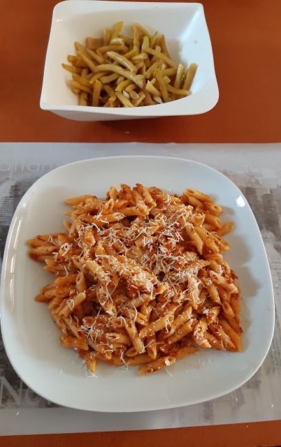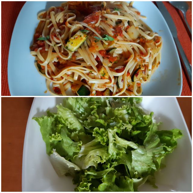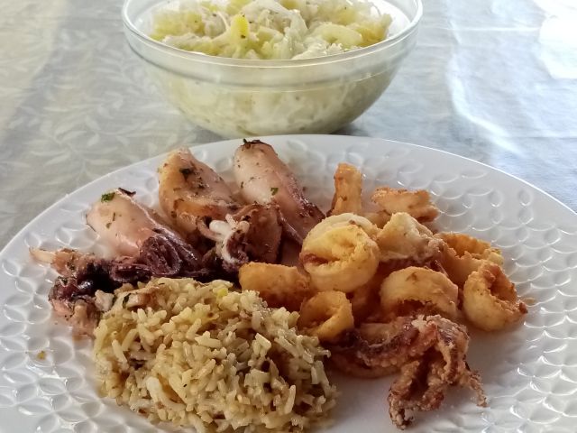 Basmati riž s porom in malancani, praženi in frigani lignji; zeljnata solata; tudi zalit je bilo treba