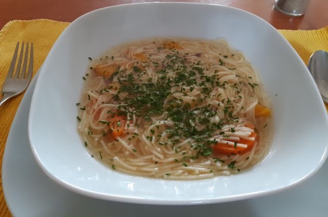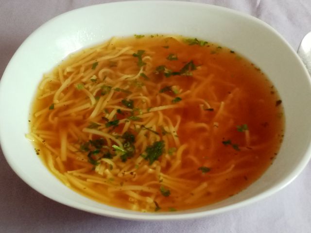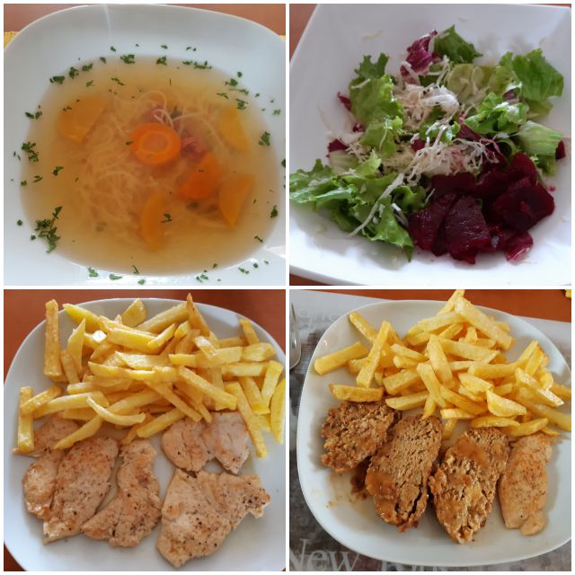 Piščančja juhica; paniran zrezek, omakica; zelena solata