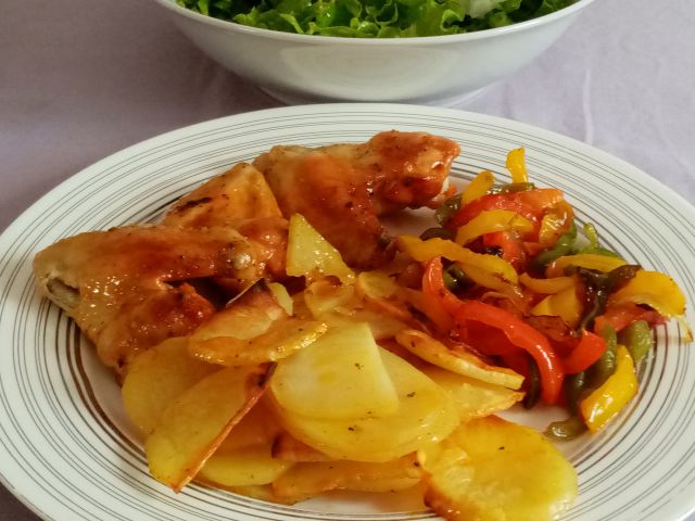 Gov. juhica iz zaloge; pečene perutničke in krompir, pražena paprika; zelena solata