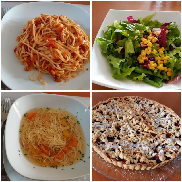 Danes goveja juha z rezanci, testenine z domačo paradižnikovo omako, solata, pita z breskvami in višnjami