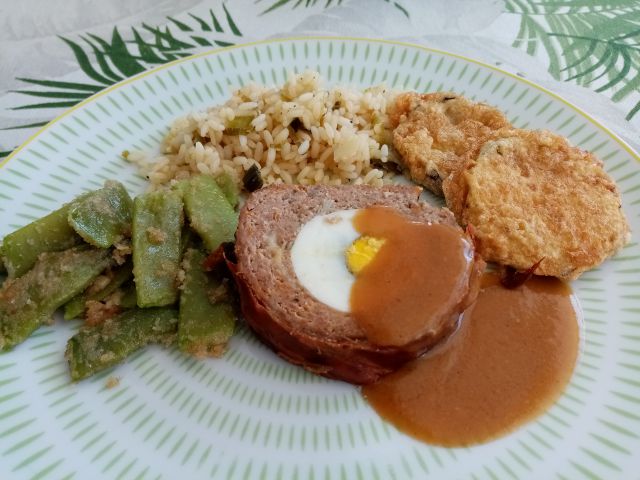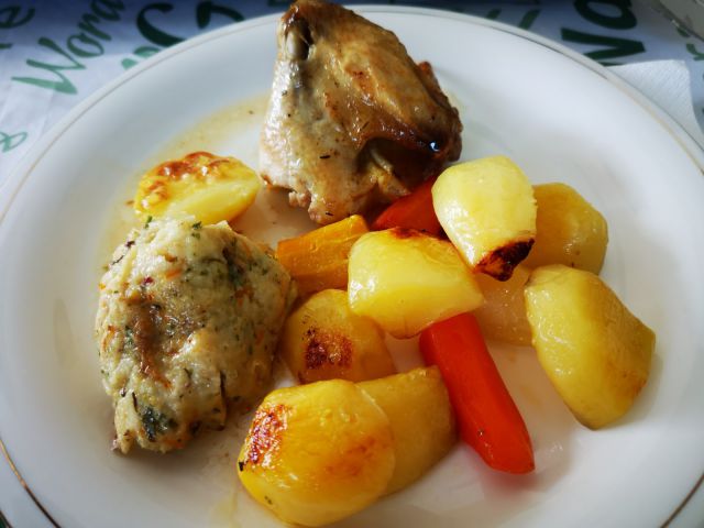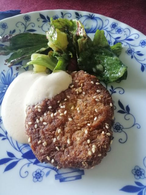 Danes sem skuhala juho s krompirjem in graškom in malo druge zelenjave, a te le za vzorec (koren peteršilja in malo korenčka), potem pa polpete iz jajčevcev in bučk kot glavnima sestavinam, seveda lepo začinjene, potem pa povaljane v moki, zmešani s sezamom, in ocvrte. Zraven omaka iz jogurta in začimb (česen, dimljena paprika, sesekljan drobnjak pasta iz pečene paprike) in radič s krompirjem in fižolom. Odlino je bilo, četudi brez mesa.