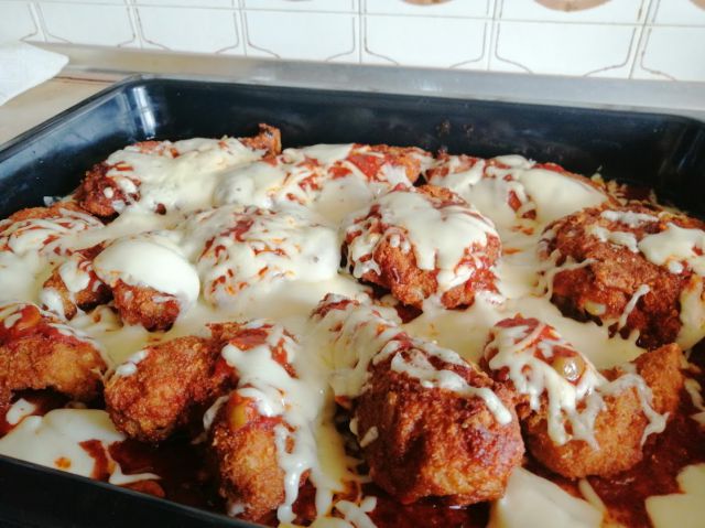 Ocvrt piščanec v paradižnikovi omaki, gratiniran z mocarelo. Zraven je bila zeliščna polenta, pa seveda solata, pred tem pa zelenjavna juha.
