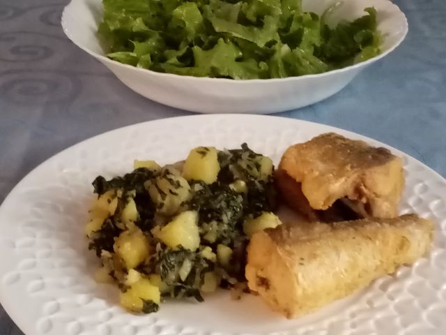 Krompir z blitvo, pečen oslič; zelena solata