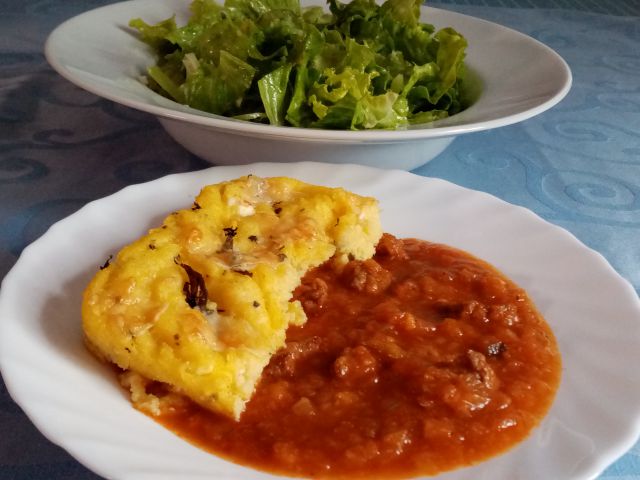 Goveji golaž, zapečena polenta z zelišči; zelena solata
