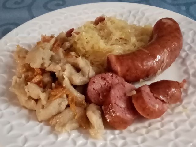 Dušeno kislo zelje, klobasa, ajdovi žganci s popečeno čebulo