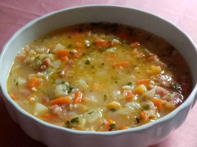 Kostna juha z rezanci, golaž, krompirjevi žganci, solata s fižolom, domač sadni smoothie, kava