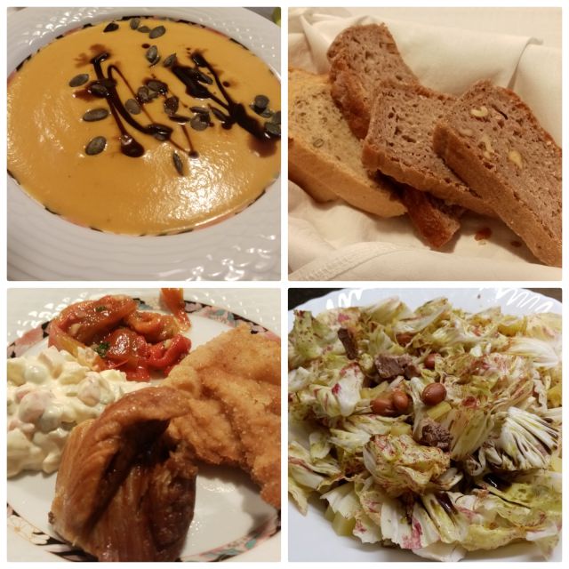 Bučna juhica s popečenimi semeni, ostanki mesa od včeraj, francoska, paprika s česnom, radič s krompirjem, ajdov kruh z orehi...