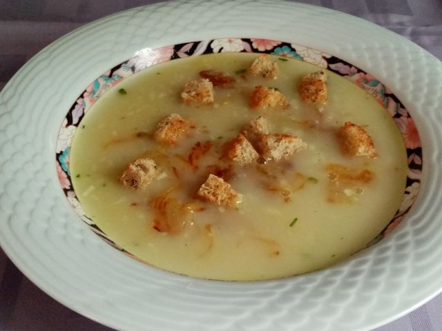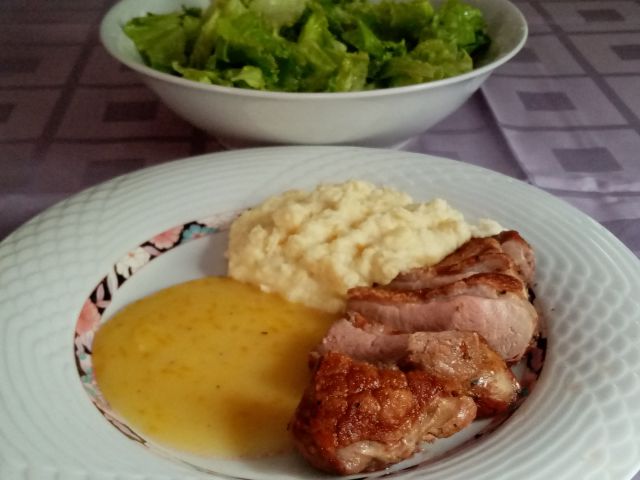 Čebulna juhica s krutoni; račja prsa, pomarančna omaka, pire z zeleno; zelena solata
